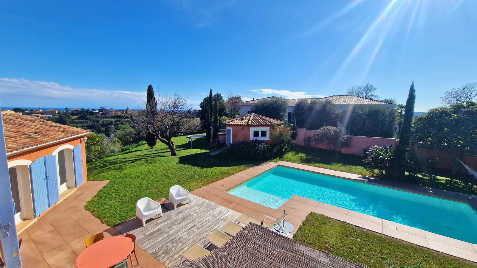 Implantée sur un terrain d’environ 4000 m², cette belle propriété offre une vue dégagée sur les collines environnantes et un ensoleillement optimal grâce à son exposition Sud/Sud-Ouest.