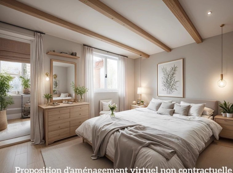 À l’étage : Suite parentale disposant d’une grande salle de bains et d’un dressing, ainsi qu’une seconde chambre avec salle de bains.