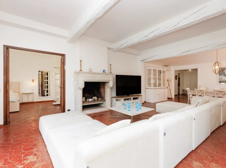 Le séjour, véritable cœur de la maison, est sublimé par une majestueuse cheminée en pierre qui invite à de douces soirées en famille ou entre amis.